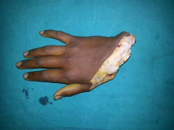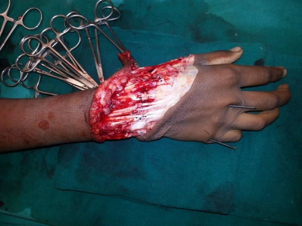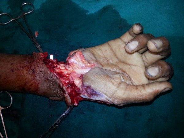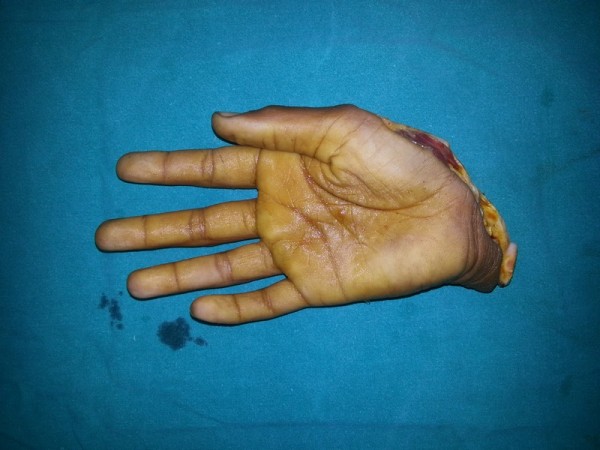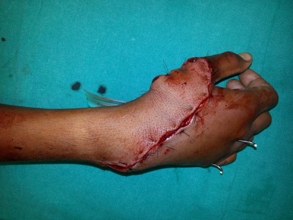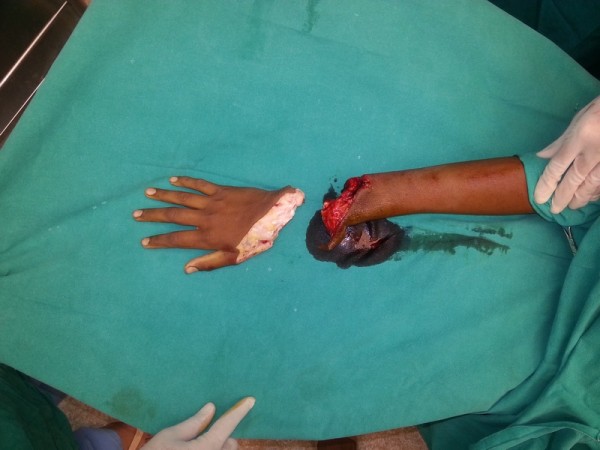13 yr boy had the traumatic amputation of right hand while working on grass cutting machine. Reimplantation was done.