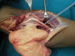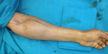 After doing all the relevant investigations surgery was planned. During surgery, the swelling was carefully separated from brachial, radial, ulnar arteries. Median nerve was going through a tumour which was carefully separated under the microscope. Swelling 15cm X 8cm was excised. It was fibrolipoma on histopathological examination. At present his Rt forearm was looking completely normal like opposite forearm.